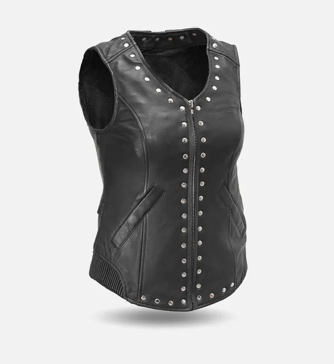 Women's Classic Motorcycle Leather Vest with Studding Details - Real Lambskin Leather Vest for Females, Ladies Biker Vest