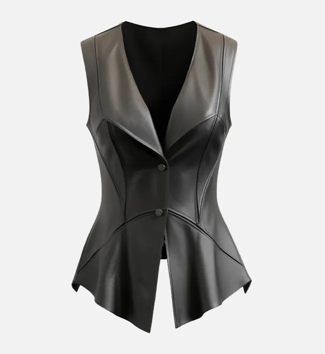 Women’s Black Sheepskin Leather Vest with Flared Bottom & Cut-Back Hemlines