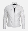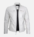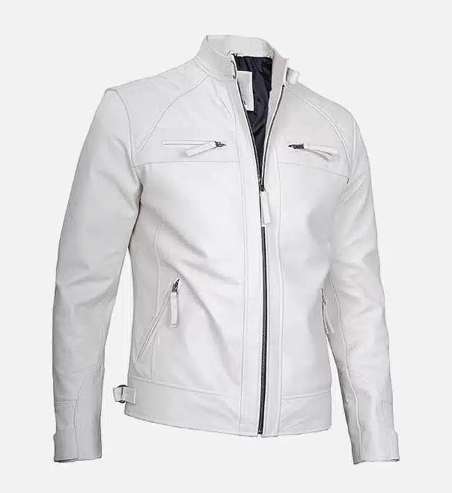 Elevate your style with this premium men’s leather jacket, crafted from 100% genuine sheepskin leather for a soft, durable feel and lasting quality. The crisp white finish, complemented by quilted shoulder panels, contrasting black zippers, and a belt-style waist, delivers a classic yet modern silhouette perfect for everyday wear and smart-casual occasions.