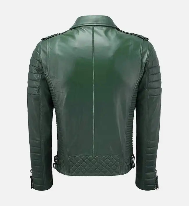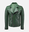 Elevate your outerwear game with this bold men’s moto leather jacket, expertly crafted from 100% genuine sheepskin leather for a soft yet durable feel. Designed in a striking green shade, this jacket features a signature biker silhouette with quilted detailing and metallic accents that deliver a powerful, contemporary edge.