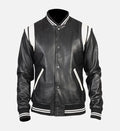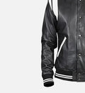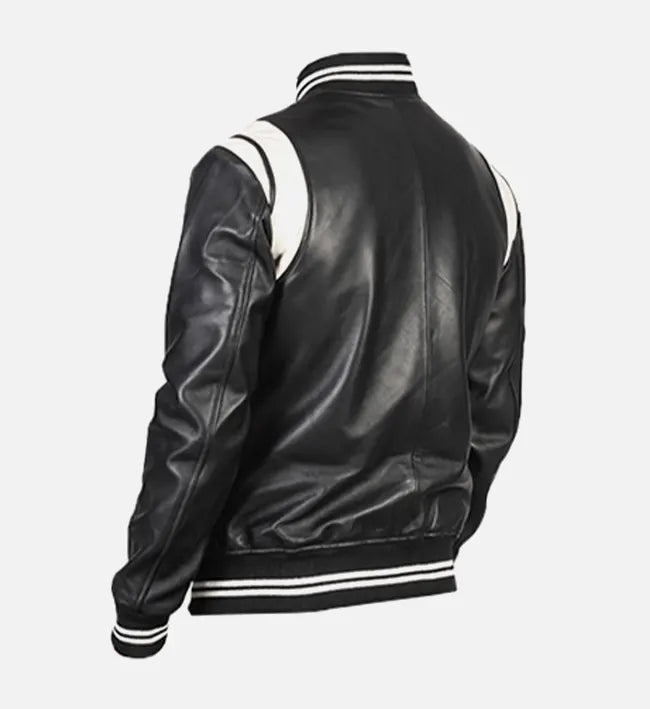 Designed for a bold yet refined look, this men’s leather jacket is crafted from 100% genuine sheepskin leather, offering a smooth texture with lasting durability. The boxy fit silhouette paired with striking white patches and rib-knitted accents gives this jacket a modern street-style edge while maintaining everyday comfort.