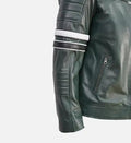 Elevate your outerwear collection with this premium men’s leather jacket, expertly crafted from 100% genuine sheepskin leather for a refined look and lasting durability. Finished in a bold dark green shade, this jacket features striking quilted patterns and contrast shoulder straps with white piping, delivering a modern yet distinctive style.