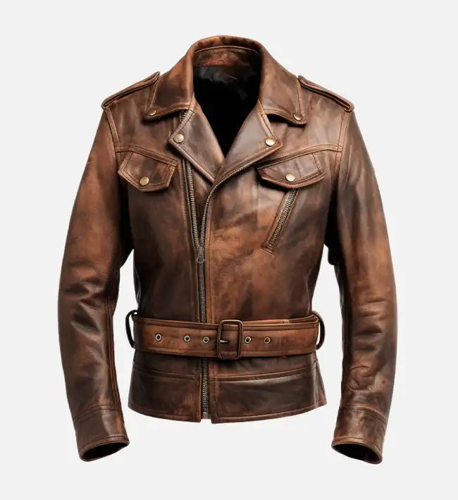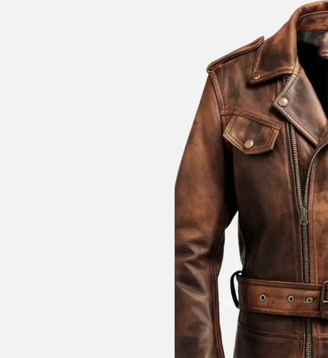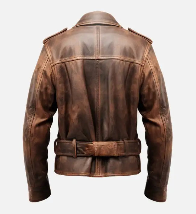 • Distinctive Design Details: Rider-style jacket with shoulder epaulets, stud button accents, streamlined panels, adjustable waist belt, and a distressed finish for a bold, modern look.