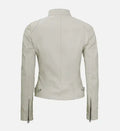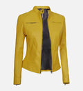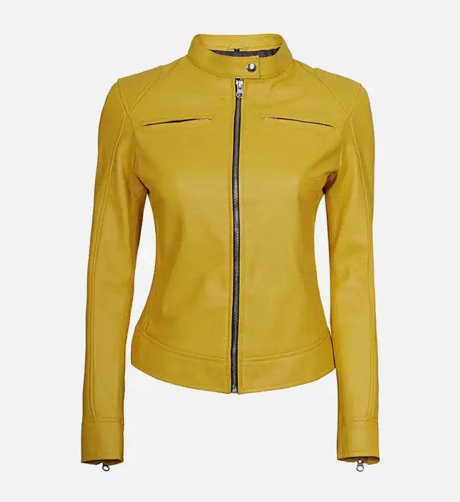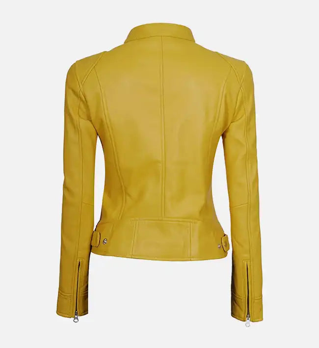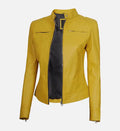 Add a chic, modern touch to your wardrobe with this women’s leather jacket, crafted from 100% genuine sheepskin leather for a soft, supple feel and long-lasting durability. The striking white and yellow color combination, paired with silver zipper accents and a streamlined back design, offers a stylish and contemporary look perfect for casual outings or evening wear.