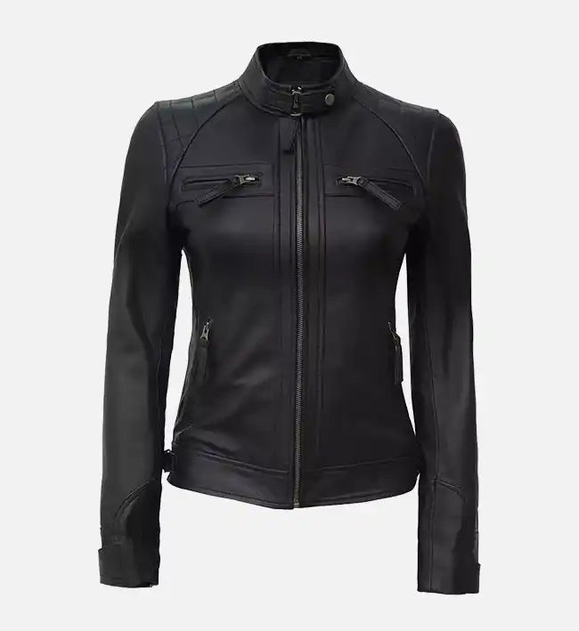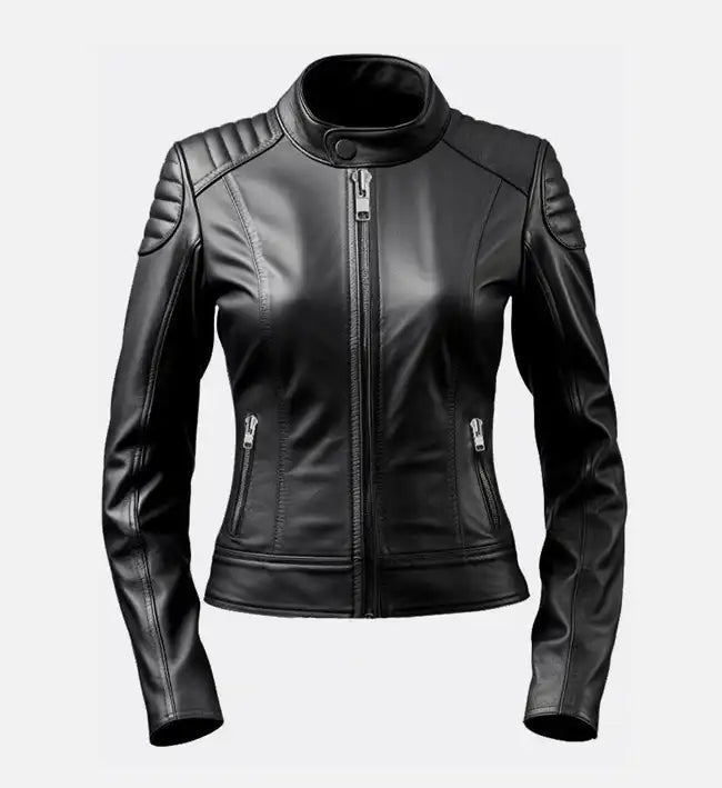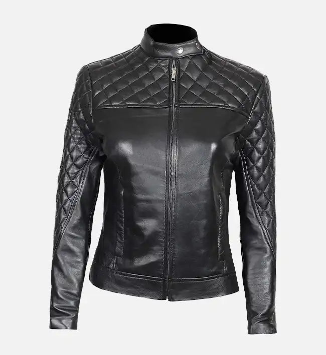 Women’s Black Sheepskin Café Racer Leather Jacket – Slim Fit Quilted Design