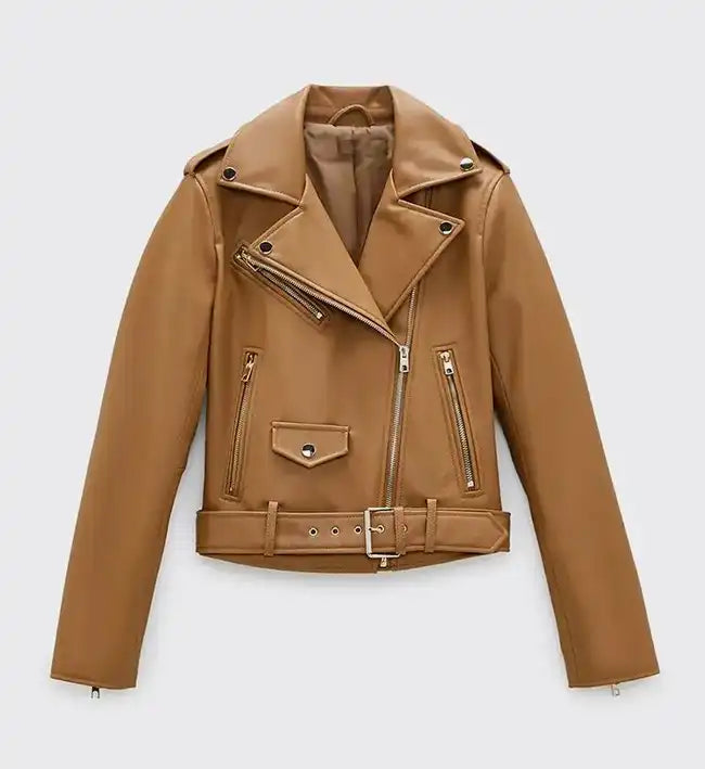 Women’s Sheepskin Leather Moto Jacket – Tan Brown with Asymmetrical Zipper