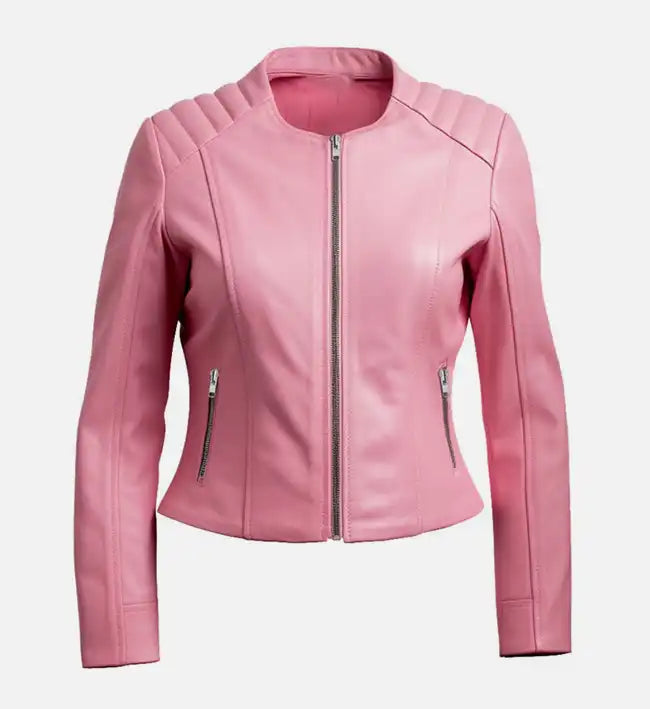 Women’s Pink Sheepskin Leather Biker Jacket – Cropped Fit with Quilted Shoulders
