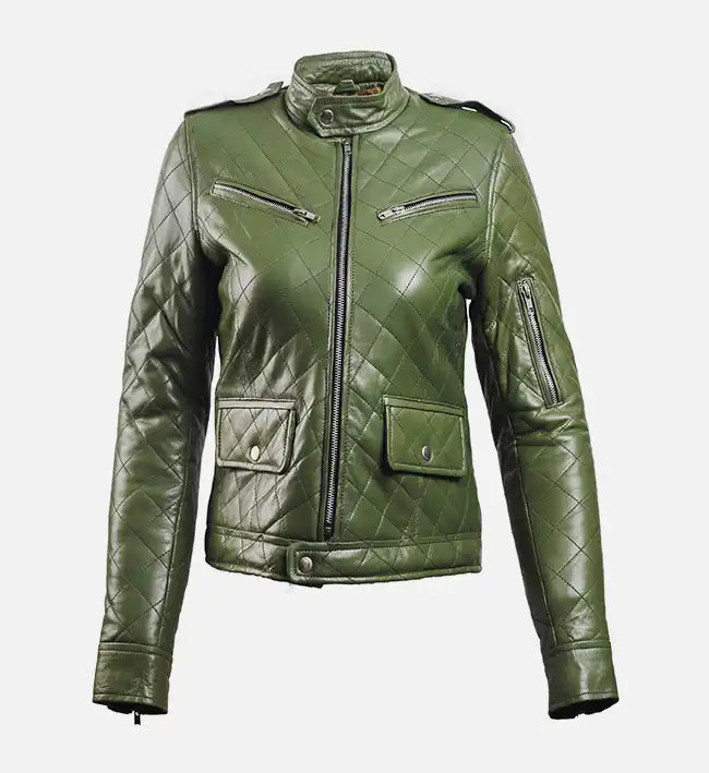 Women’s Green Sheepskin Leather Puffer Jacket – Quilted Classic Style