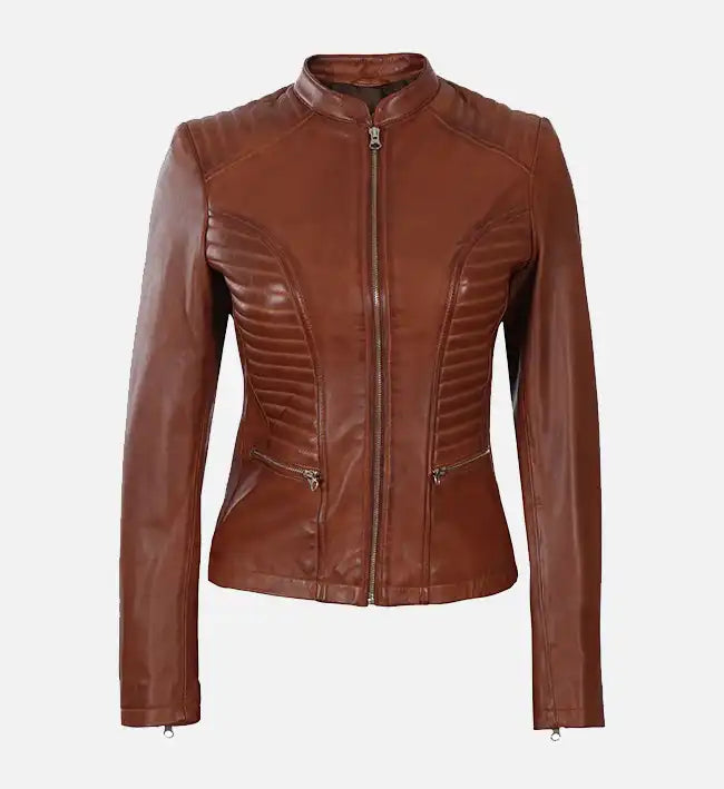 Women’s Sheepskin Leather Jacket – Brown Cafe Racer with Quilted Shoulders Elevate your style with...