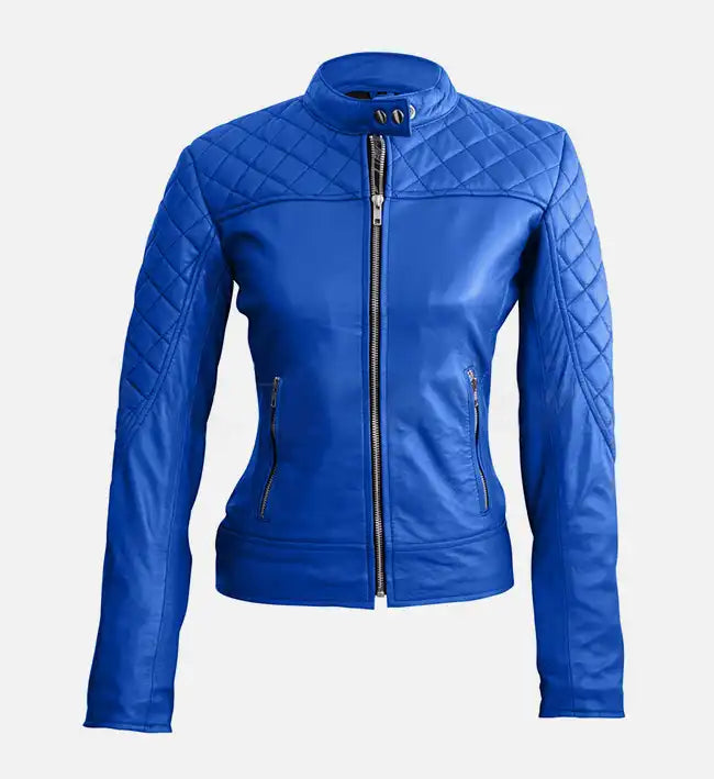 Women’s Blue Sheepskin Leather Café Racer Jacket with Quilted Detailing Add a bold pop of...