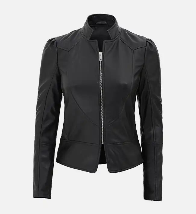 Women’s Black Slim-Fit Sheepskin Leather Jacket – Minimalist Stand Collar Design Crafted for the modern...