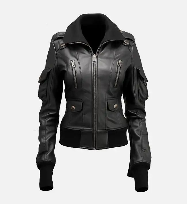 Women’s Black Sheepskin Leather Bomber Jacket – Ribbed Collar & Fitted Silhouette Elevate your outerwear...