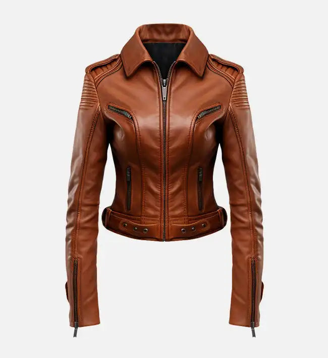 Women’s Sheepskin Leather Jacket – Brown with Quilted Shoulders and Belted Waist Elevate your style...