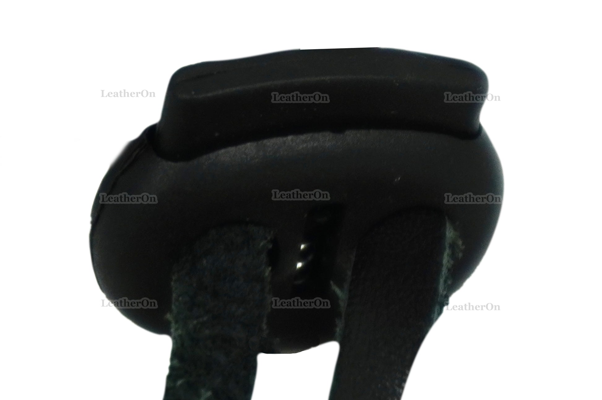 Adjustable strap with plastic buckle/button. Tight it for perfect fit