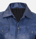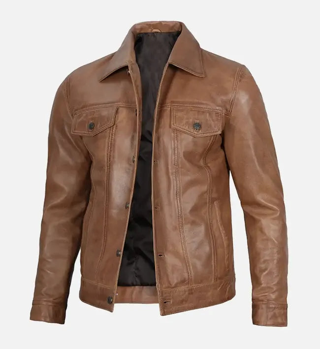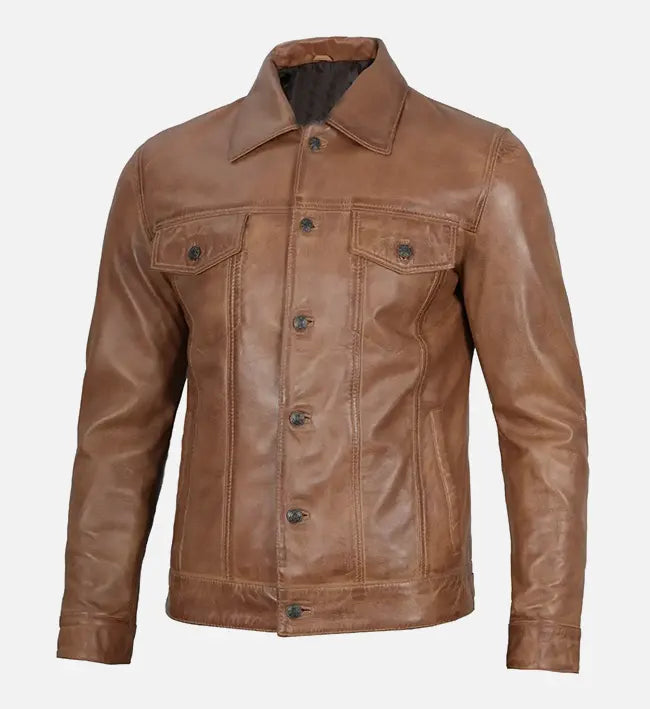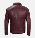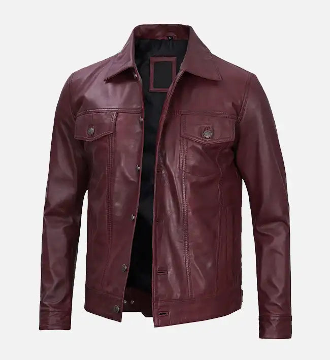 Men’s Sheepskin Trucker Leather Jacket – Camel Brown, Maroon & Blue with Shirt-Style Collar