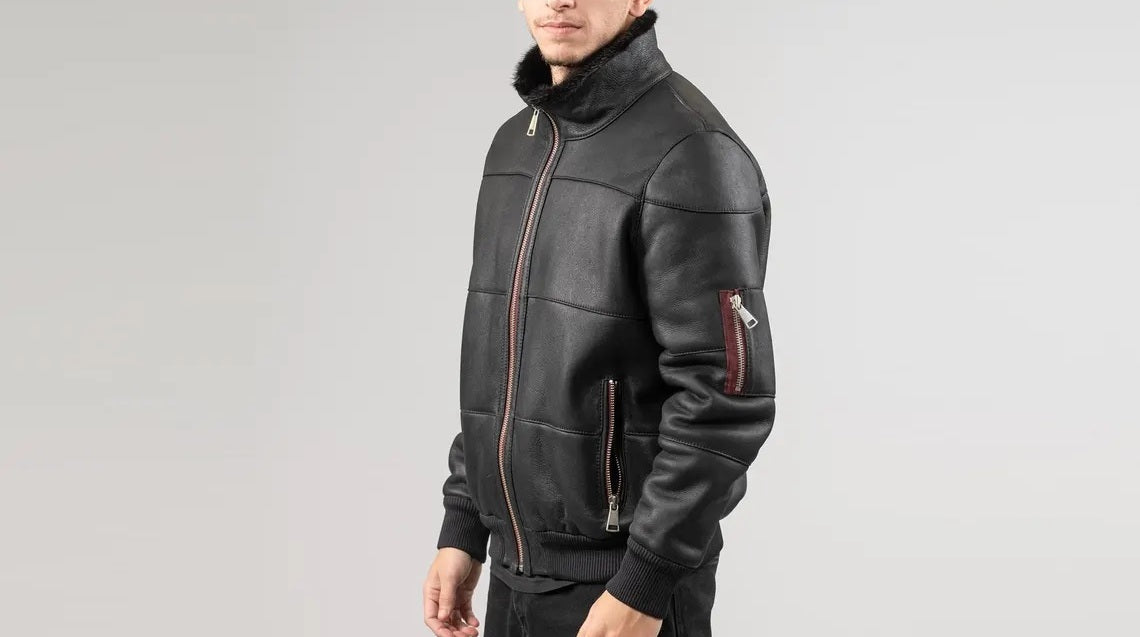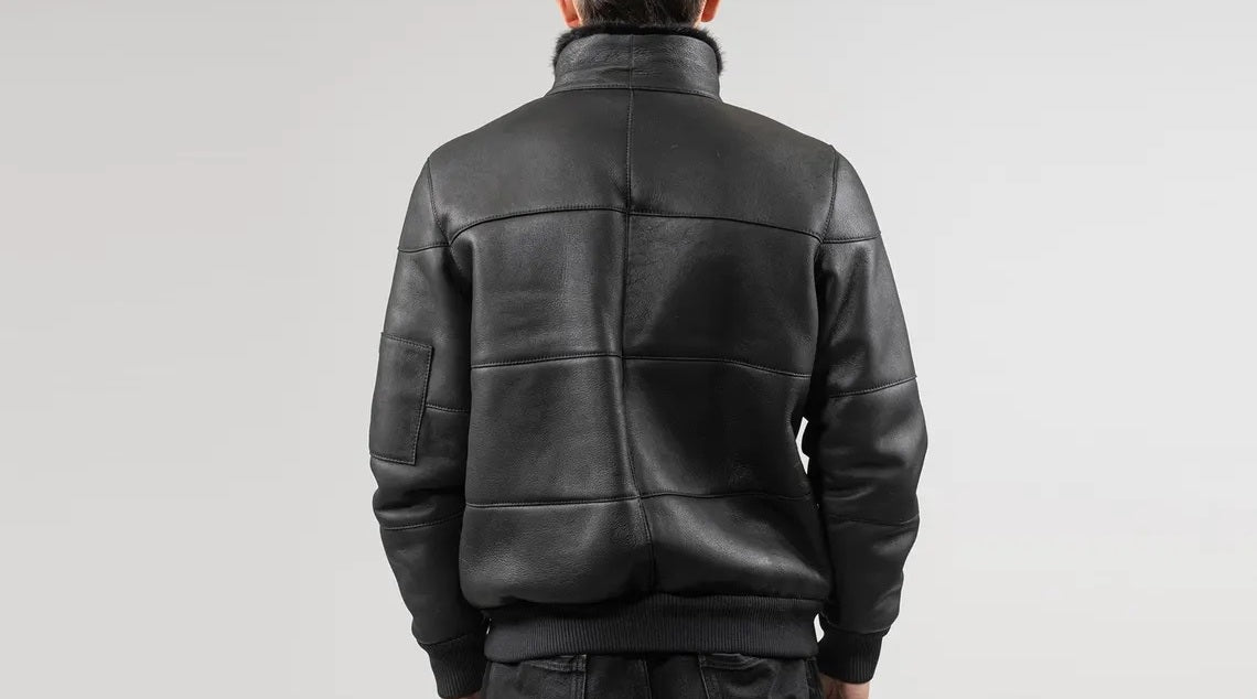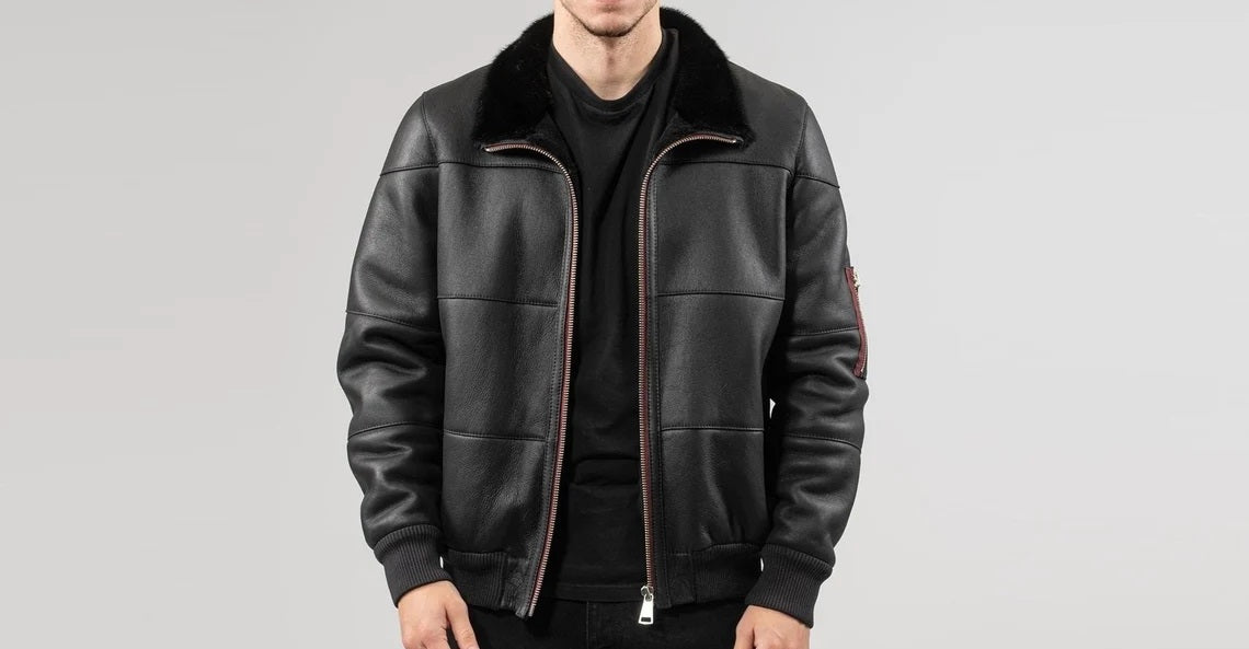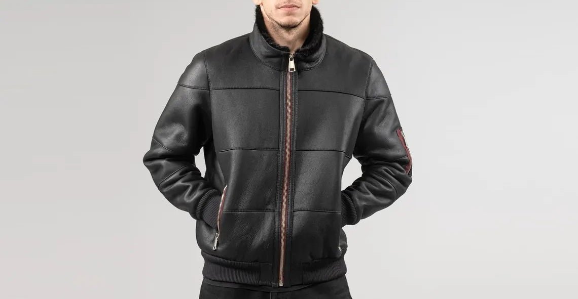 Men's Motorcycle Bomber Leather Jacket with Fur Collar - Genuine Lambskin Leather Cafe Racer Jacket - Classic Casual Leather Jacket
