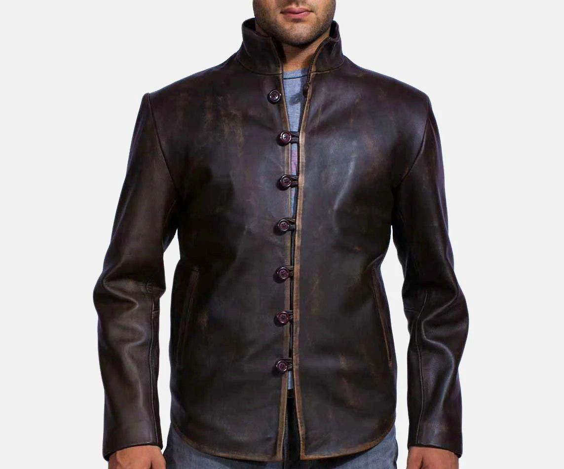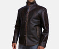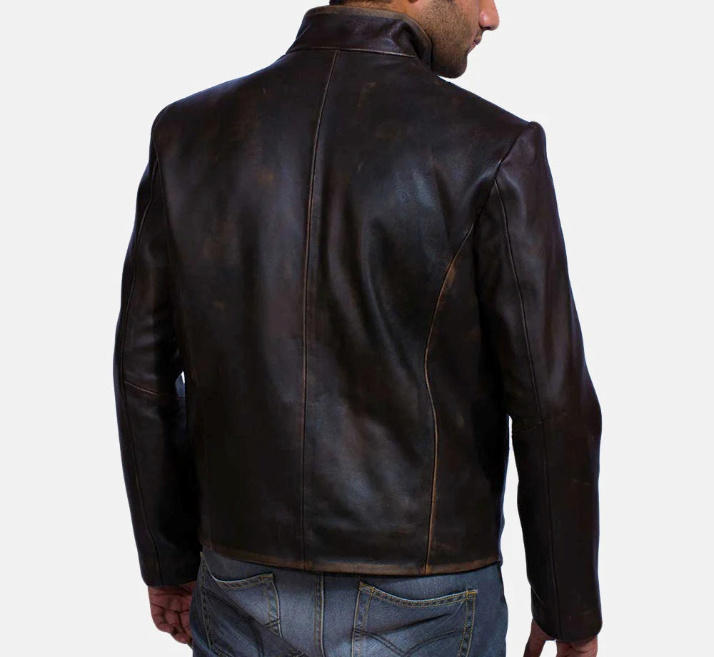 Men's Motorcycle Distressed Brown Leather Jacket - Genuine Lambskin Leather Cafe Racer Jacket - Biker Band Collar Jacket
