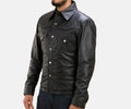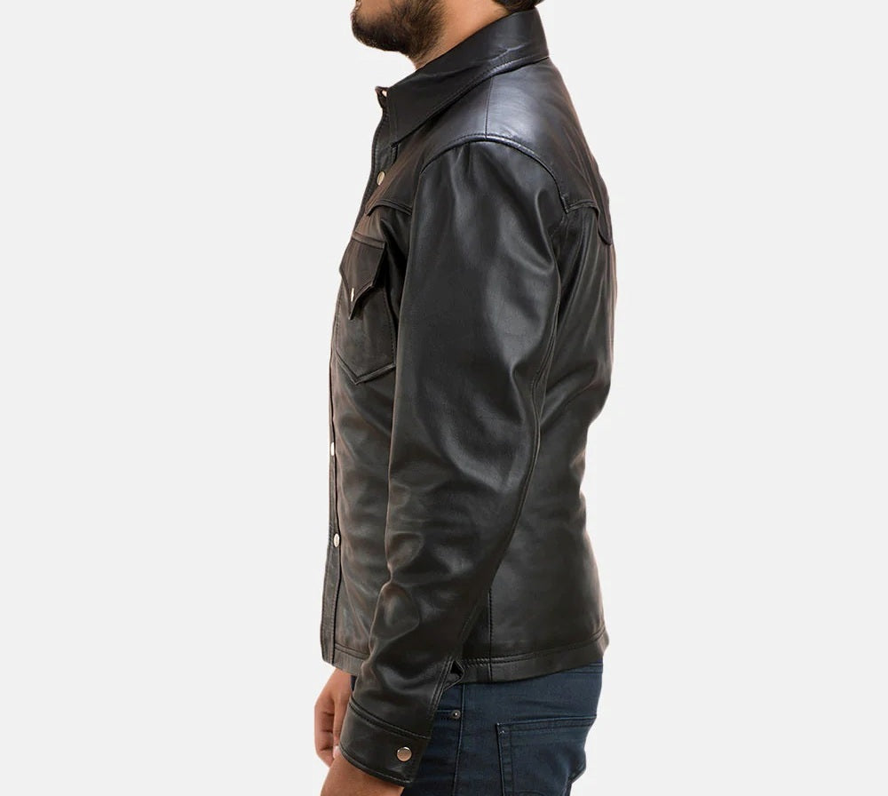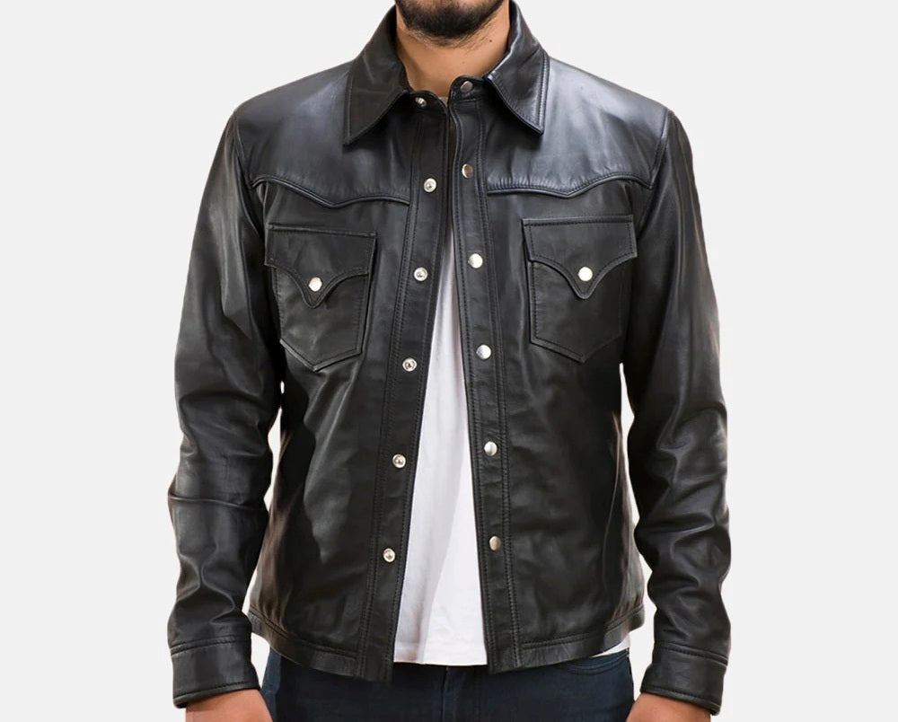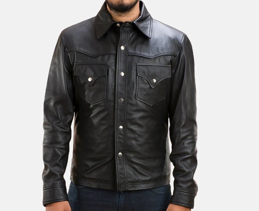 Men's Motorcycle Shirt Style Leather Jacket - Genuine Lambskin Leather Cafe Racer Button Style Jacket - Casual Biker Jacket