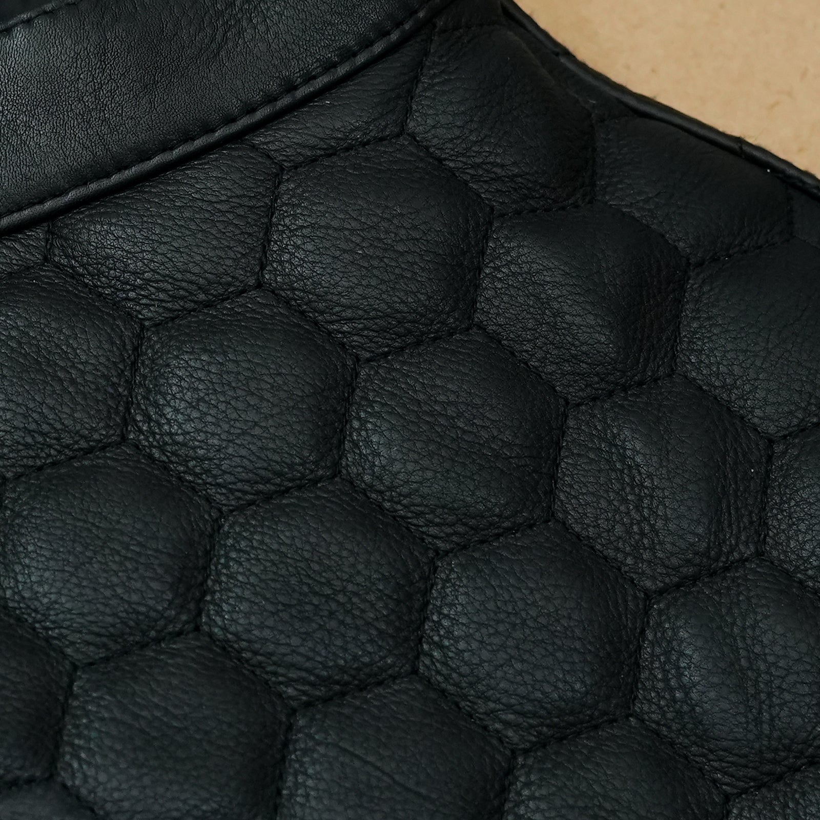 It boasts a bold black honey comb stitch design. It has both YKK zip closure and real Brass hidden snap closure. There are total 8 pocket. 4 outer pockets. 4 inner pockets. Inner material is non-allergic 100% Polyester fabric liner.