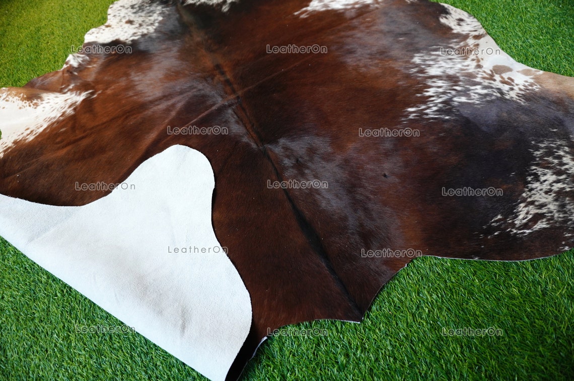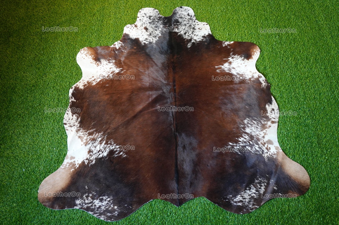 Small (4.7 X 4.6 ft.) EXACT As Photo, Tricolor COWHIDE Area RUG | 100% Natural Cowhide Rug | Hair-on Leather Cow Hide Rug | C584