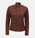 Women’s Sheepskin Leather Jacket – Brown Cafe Racer with Quilted Shoulders