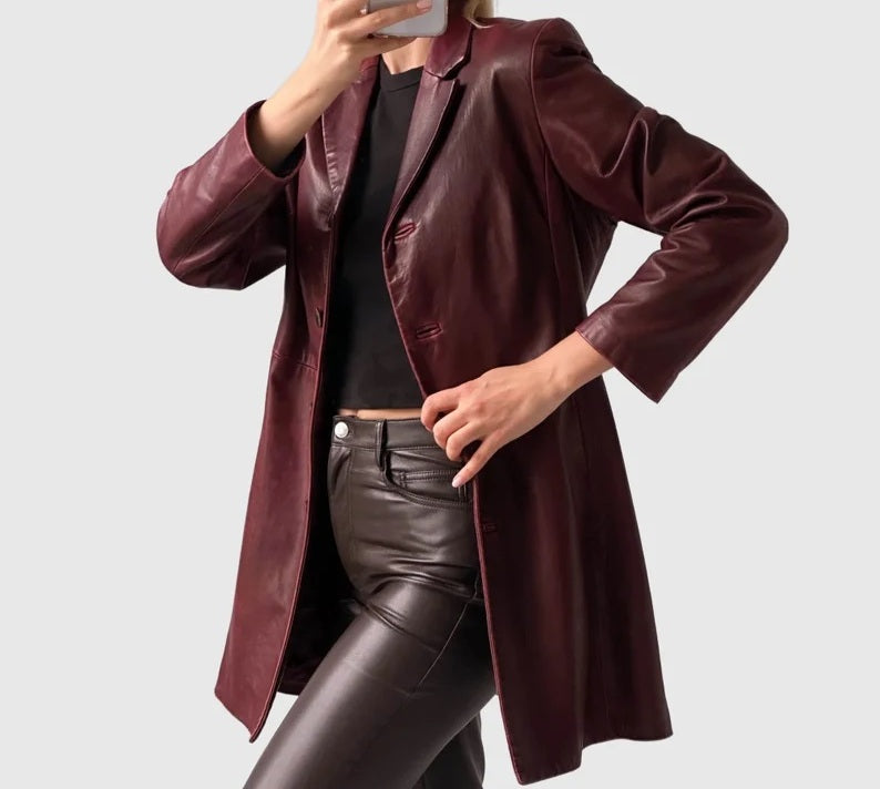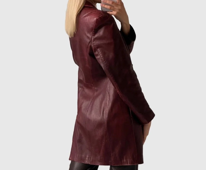 Make a statement with this stunning women's burgundy long leather coat, expertly crafted from premium leather. The rich, vibrant color and supple texture evoke luxury and sophistication.