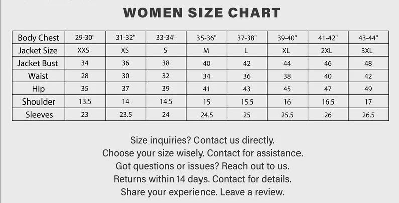 Note: You will need to add at least 2" to you actual measurements in the mid body (bust, high hip) to determine which jacket size would be best suitable for you.