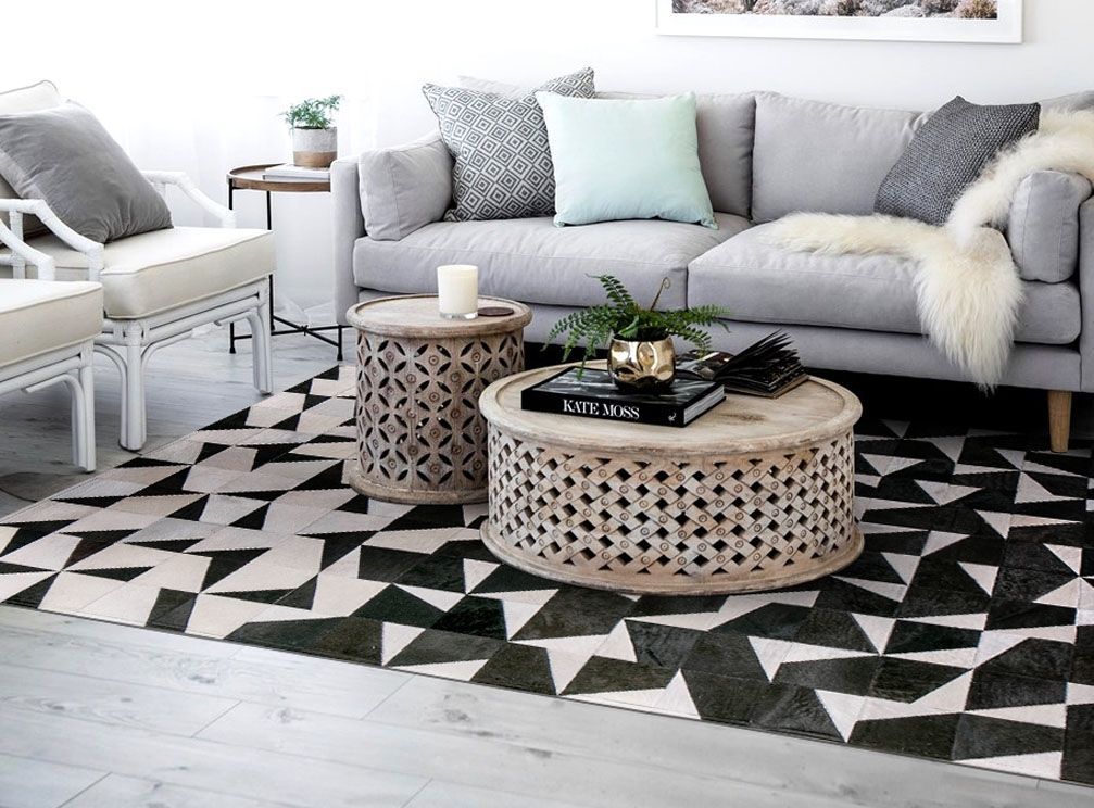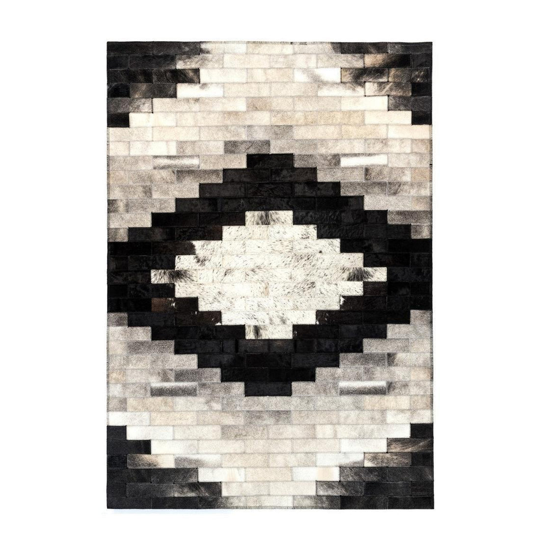 HANDMADE Natural HIDE RUG | Grey White Triangle Pattern Patchwork Area Rug | Cowhide Hallway Runner | PR178