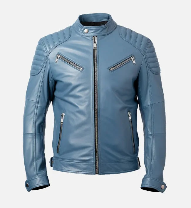 Men’s Blue Sheepskin Leather Jacket with Shoulder Epaulettes Designed for men who prefer bold detailing...