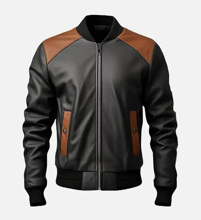 Men’s Sheepskin Leather Bomber Jacket – Black & Brown Contrast Design