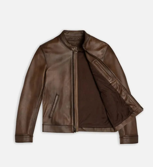 Crafted for style and durability, this men’s leather jacket is made from 100% genuine sheepskin leather, offering a soft, supple feel with long-lasting quality. The brown finish is complemented by streamlined patterns on the back and sleeves, along with a banded-style hemline, creating a modern, masculine silhouette perfect for casual and smart-casual looks.