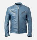 Designed for men who prefer bold detailing with a refined edge, this leather jacket is crafted from 100% genuine sheepskin leather for a premium look and feel. The rich blue color adds a modern statement, while the soft polyester lining ensures all-day comfort. Finished with stylish shoulder epaulettes, a belt-style waist, and sleek silver zipper accents, this jacket blends contemporary fashion with classic biker-inspired elements—perfect for standout everyday wear.