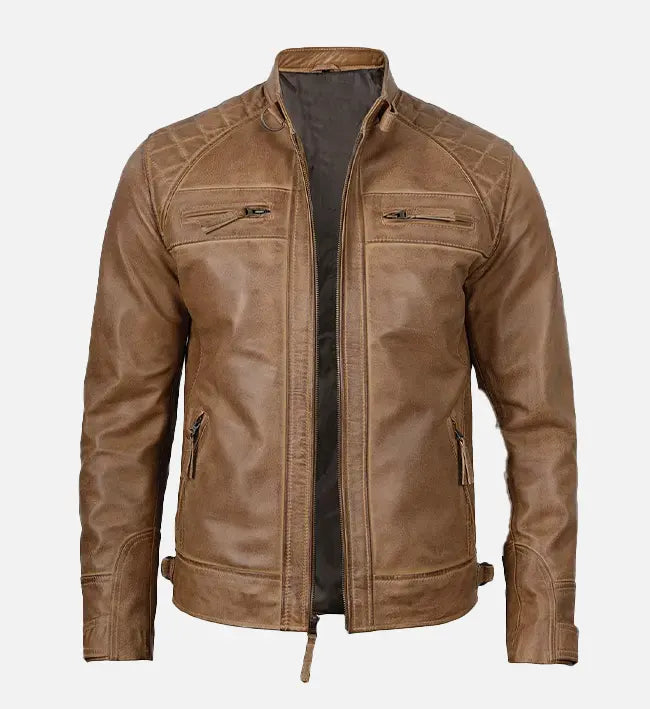 Upgrade your wardrobe with this premium men’s leather jacket, crafted from 100% genuine sheepskin leather for a soft, durable feel and long-lasting quality. The camel brown finish is complemented by quilted shoulders, streamlined patterns, and strap detailing on the hemline, creating a refined, masculine silhouette that balances classic craftsmanship with modern design.