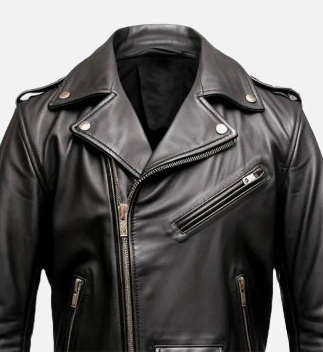 Built for bold attitude and timeless biker style, this men’s leather jacket is crafted from 100% genuine sheepskin leather and tailored for a sharp, confident silhouette. The deep black finish enhances its rugged appeal, while the soft polyester lining ensures lasting comfort. Featuring an asymmetrical zipper, notch lapel collar with snap buttons, and striking silver hardware, this jacket delivers a powerful blend of classic biker design and modern craftsmanship—perfect for statement-driven everyday wear.