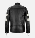 Stand out with this premium men’s leather jacket, crafted from 100% genuine sheepskin leather for a soft, durable feel and long-lasting quality. The sleek black finish is enhanced with white racing-style stripes on the sleeves, a zipper-style waist, and a stylish sleeve pocket, creating a bold, contemporary look perfect for casual wear or street-style fashion.