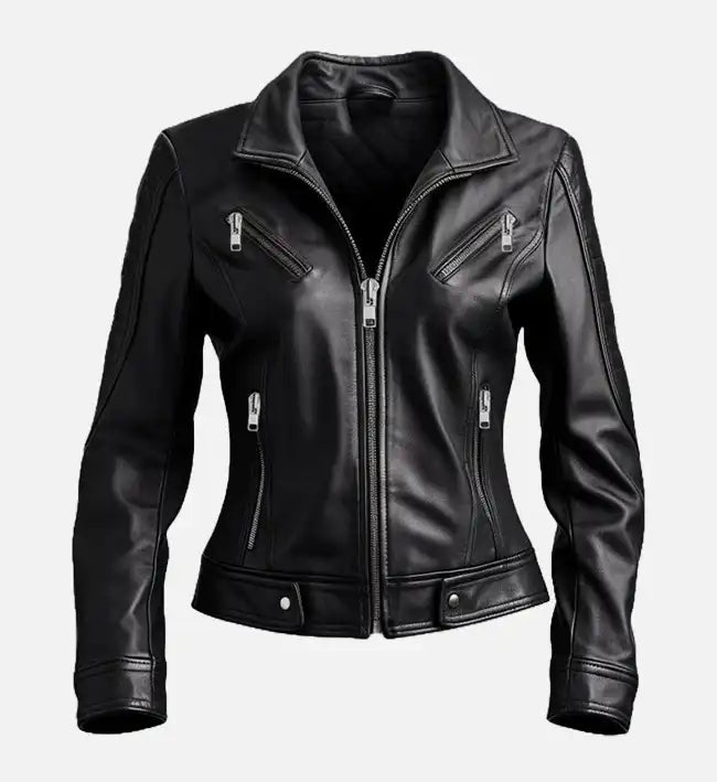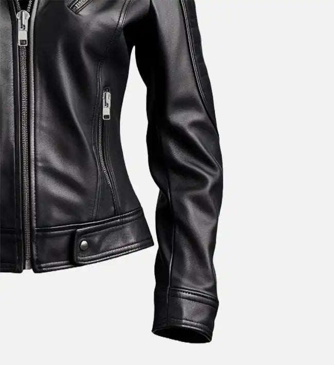 Designed for confidence and bold street style, this women’s biker leather jacket is crafted from 100% genuine sheepskin leather, offering a soft texture with long-lasting durability. The sleek black finish, fitted silhouette, and quilted padded sleeves create a striking yet timeless look, perfect for elevating everyday outfits.