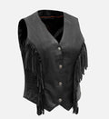 Bring bold, boho-inspired style to your wardrobe with this women’s leather vest, crafted from genuine sheepskin leather for a soft, durable, and luxurious feel. Designed in classic black with a button-front closure and V-neckline, this vest features eye-catching fringed detailing on both the front and back, creating a playful yet edgy silhouette perfect for standout layering.