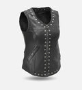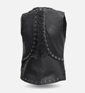 Add an edgy, modern touch to your wardrobe with this women’s leather vest, crafted from genuine sheepskin leather for a soft, durable, and luxurious feel. Designed in classic black with a V-neckline and zipper closure, this vest features bold stud accents on the front, an adjustable lace-up detail on the back, and ribbed hems for a structured yet fashion-forward silhouette.