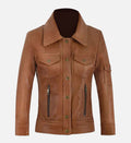 Embrace timeless style with this women’s leather trucker jacket, crafted from 100% genuine sheepskin leather for a soft, supple feel and lasting durability. The rich tan brown color and classic trucker silhouette make this jacket a versatile wardrobe essential, blending elegance with casual sophistication.