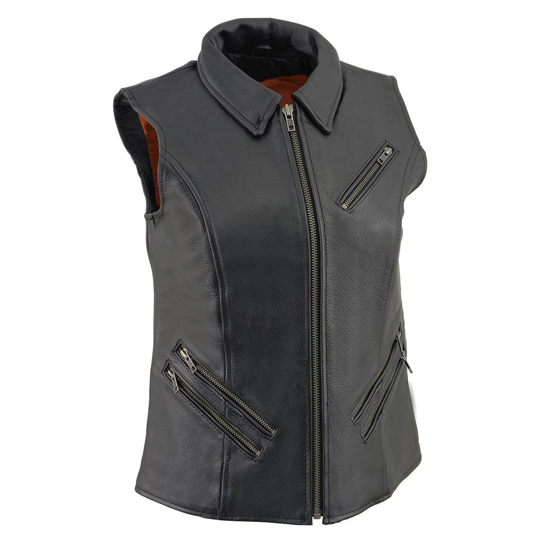 Women’s Shirt Collar Motorcycle Rider Leather Vest - Real Lambskin Leather Vest for Females, Classic Biker Vest