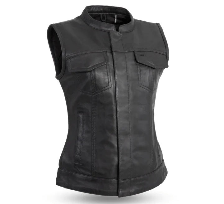 Women's Classic Motorcycle Club Style Leather Vest - Real Lambskin Leather Vest for Females, Ladies Biker Vest