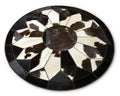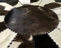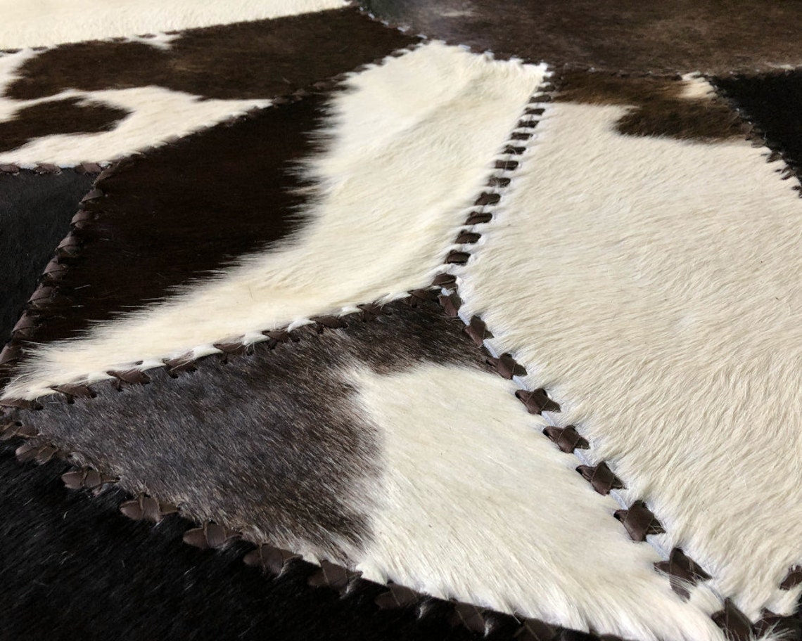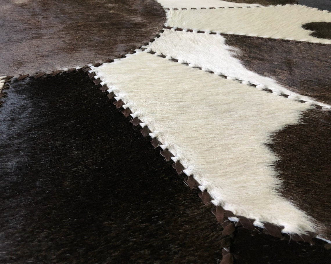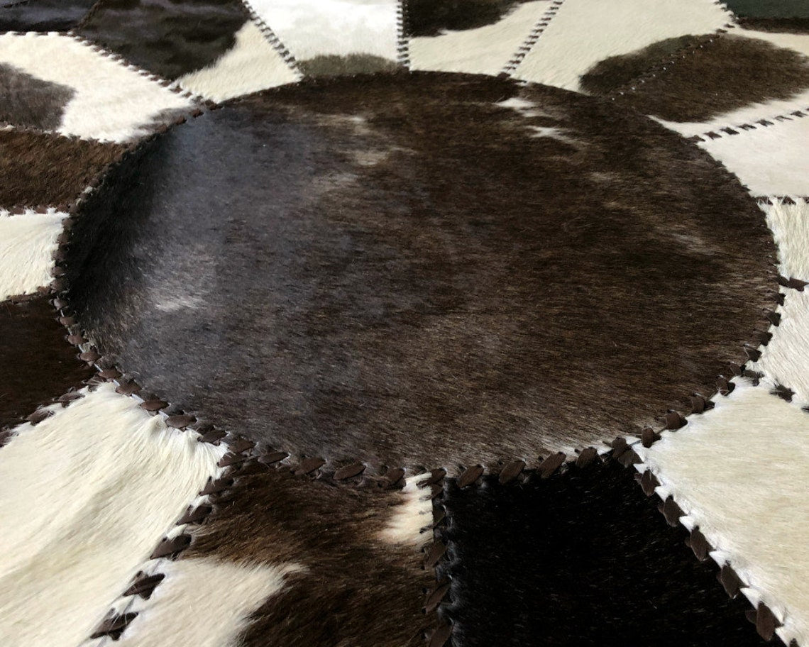 Exquisite Handcrafted Cowhide Masterpiece, 100% Natural Patchwork Area Rug | Hair on Leather Cowhide Carpet with Leather Braided Work | PR107