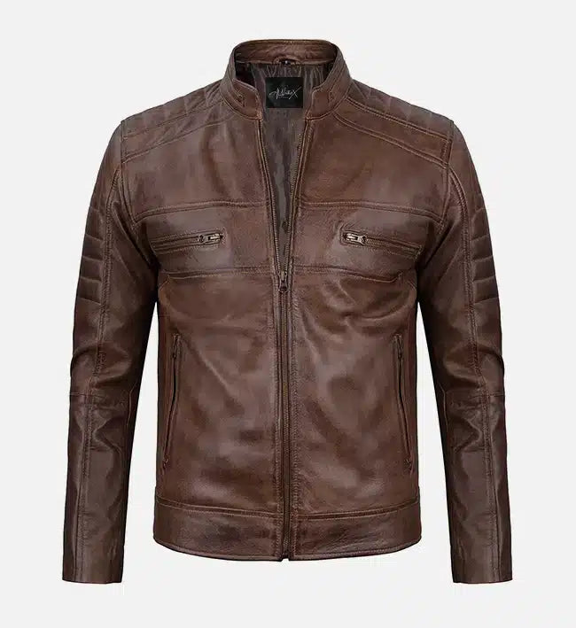 Men’s Sheepskin Leather Jacket – Brown Café Racer with Quilted Detailing