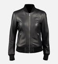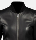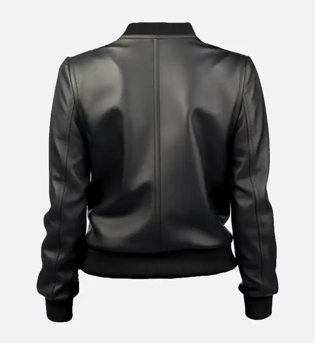 Women’s Black Sheepskin Leather Bomber Jacket – Ribbed Stand Collar