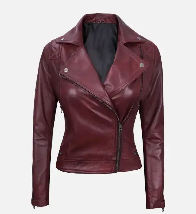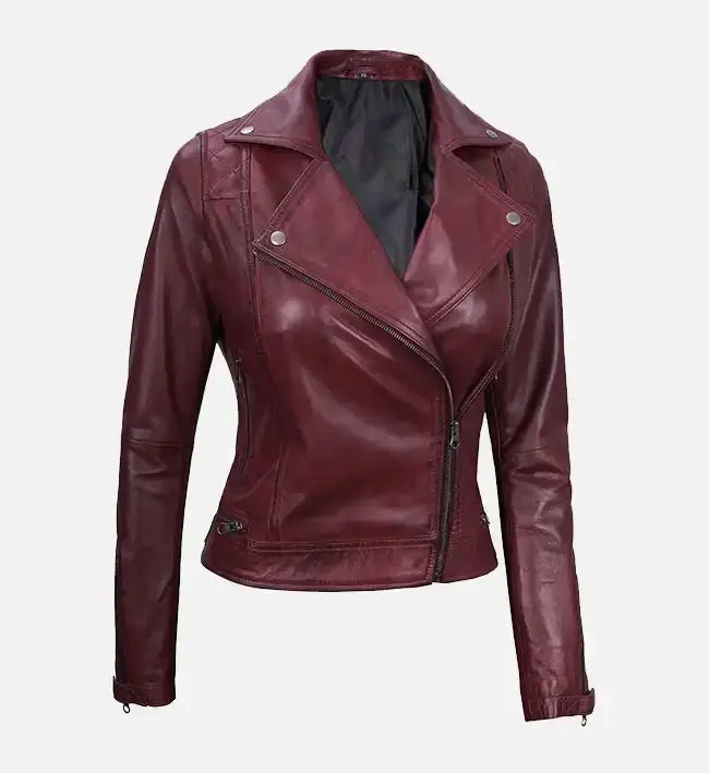 Turn heads with this bold and timeless women’s biker leather jacket, crafted from 100% genuine sheepskin leather for a soft, luxurious feel and lasting durability. Designed in a rich maroon shade, this jacket features a signature asymmetrical front, quilted shoulder detailing, and adjustable waist belts—perfectly blending edgy biker attitude with feminine sophistication.