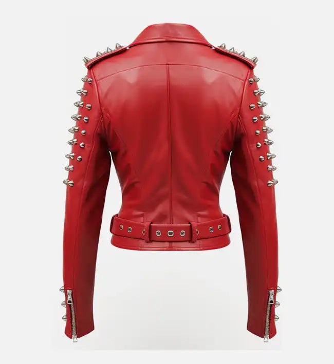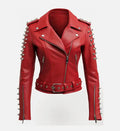 Turn heads with this bold and stylish women’s biker leather jacket, crafted from 100% genuine sheepskin leather for a soft, luxurious feel and long-lasting durability. Designed in a striking red color, this jacket features a signature asymmetrical front, pointed stud accents, and classic biker elements that bring confidence and attitude to any outfit.