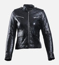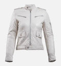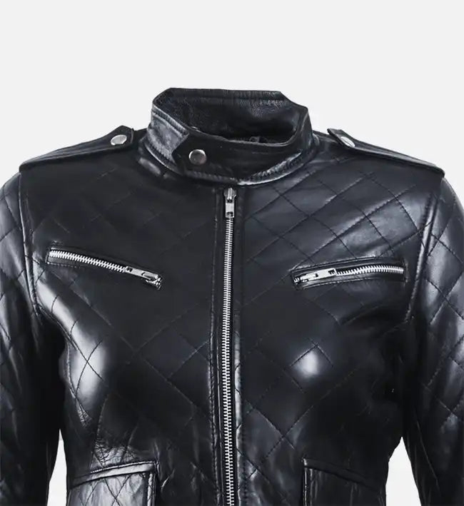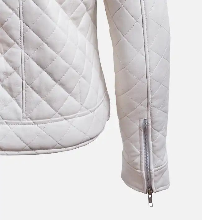 Stay warm while making a bold fashion statement with this women’s leather puffer jacket, crafted from 100% genuine sheepskin leather. Designed in a sleek black and white color combination, this jacket features quilted stitching throughout, shoulder epaulettes, and a snap-buttoned waist for a flattering, structured silhouette with modern edge.