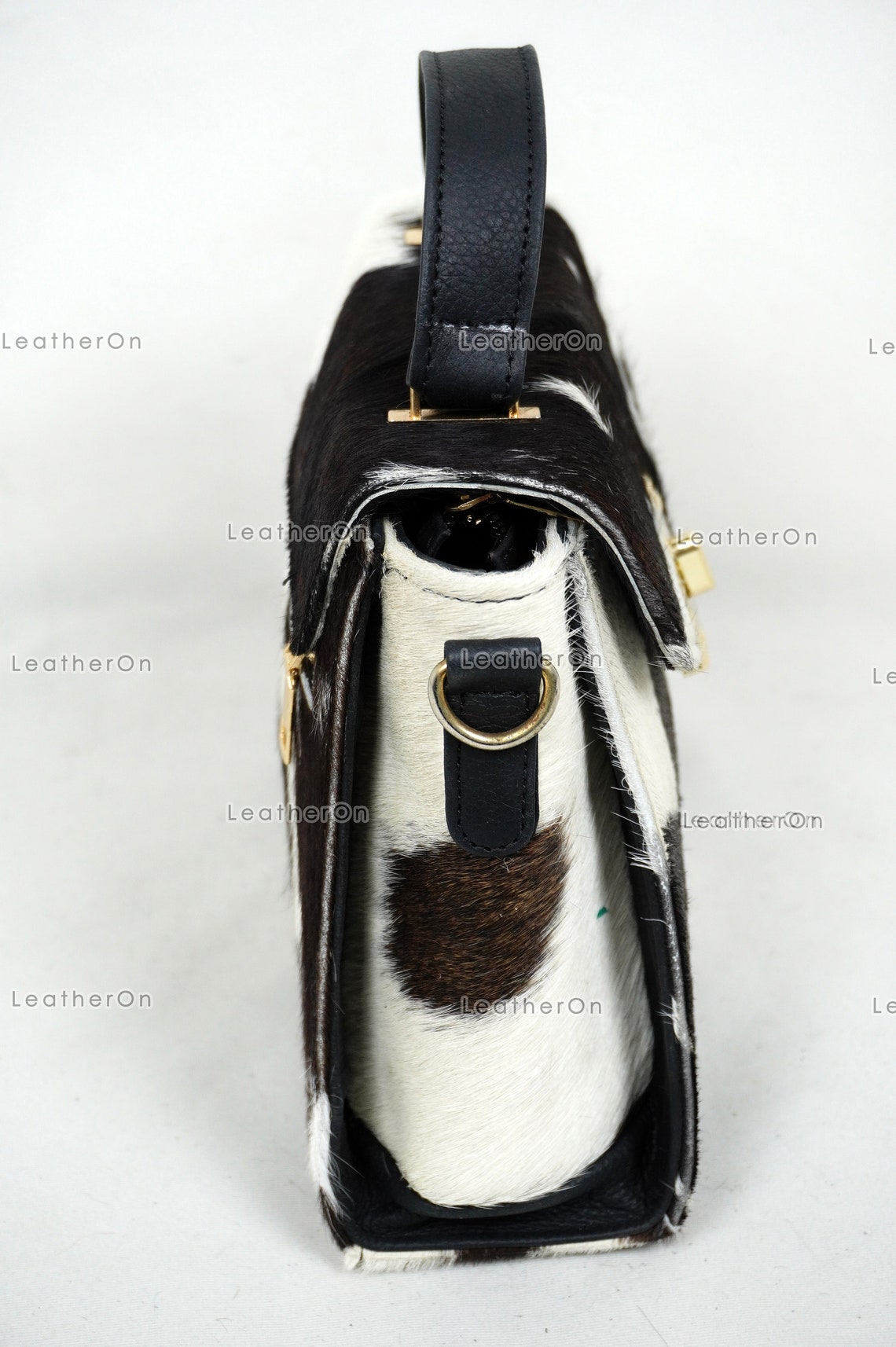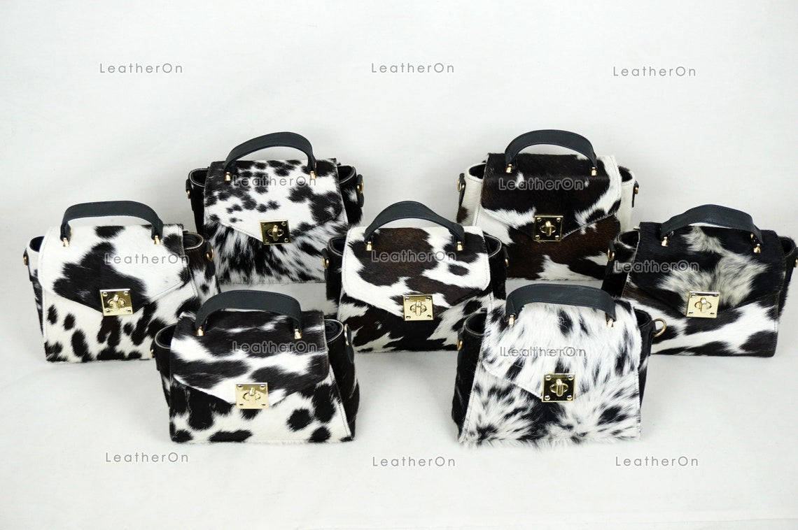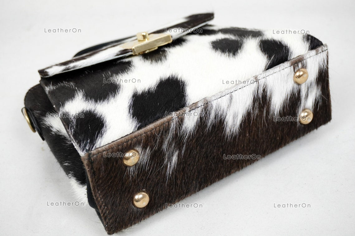 Cowhide Mini Hand Bag with Strap | 100% Natural Cowhide Top Handle Bag | Real Hair On Cowhide Leather Ladies Bag | Cow Skin Small Hand Bag
