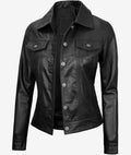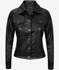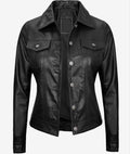 Women Four-Pocket Trucker Leather Jacket, Female's Classic Shirt Style Real Lambskin Leather Jacket