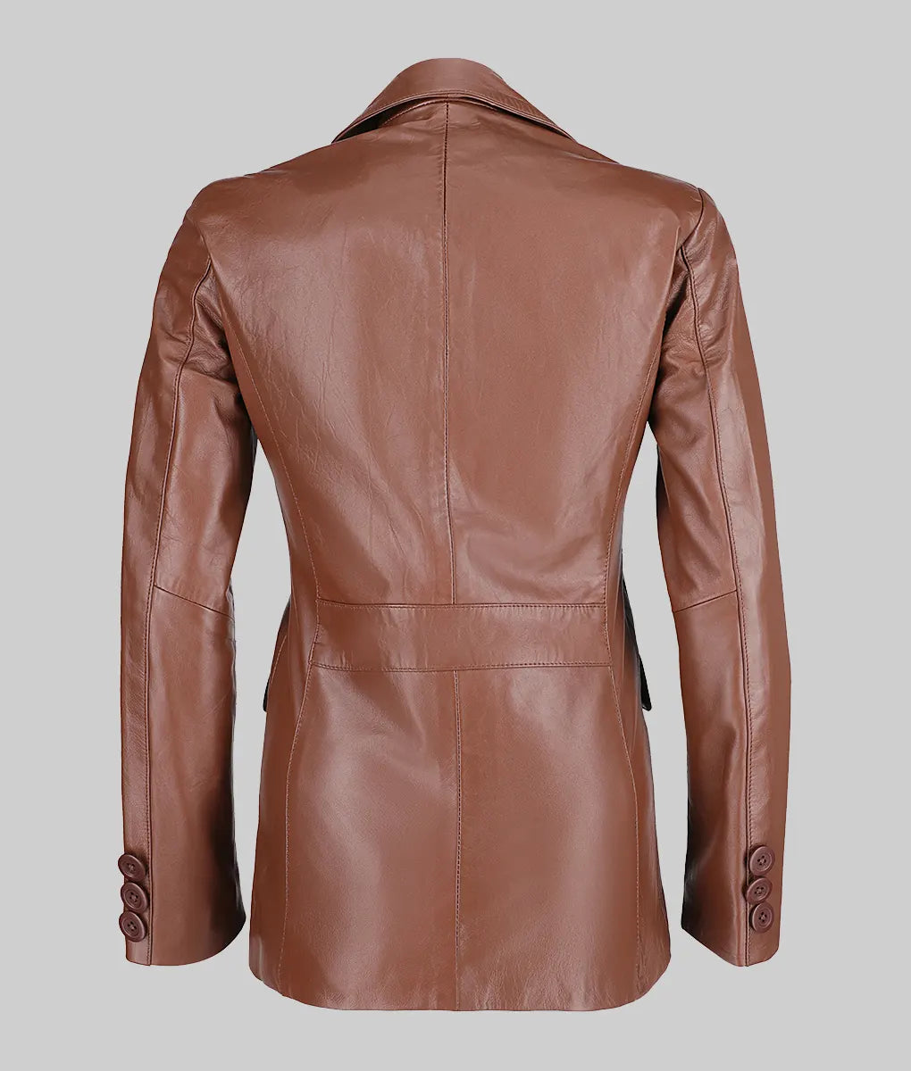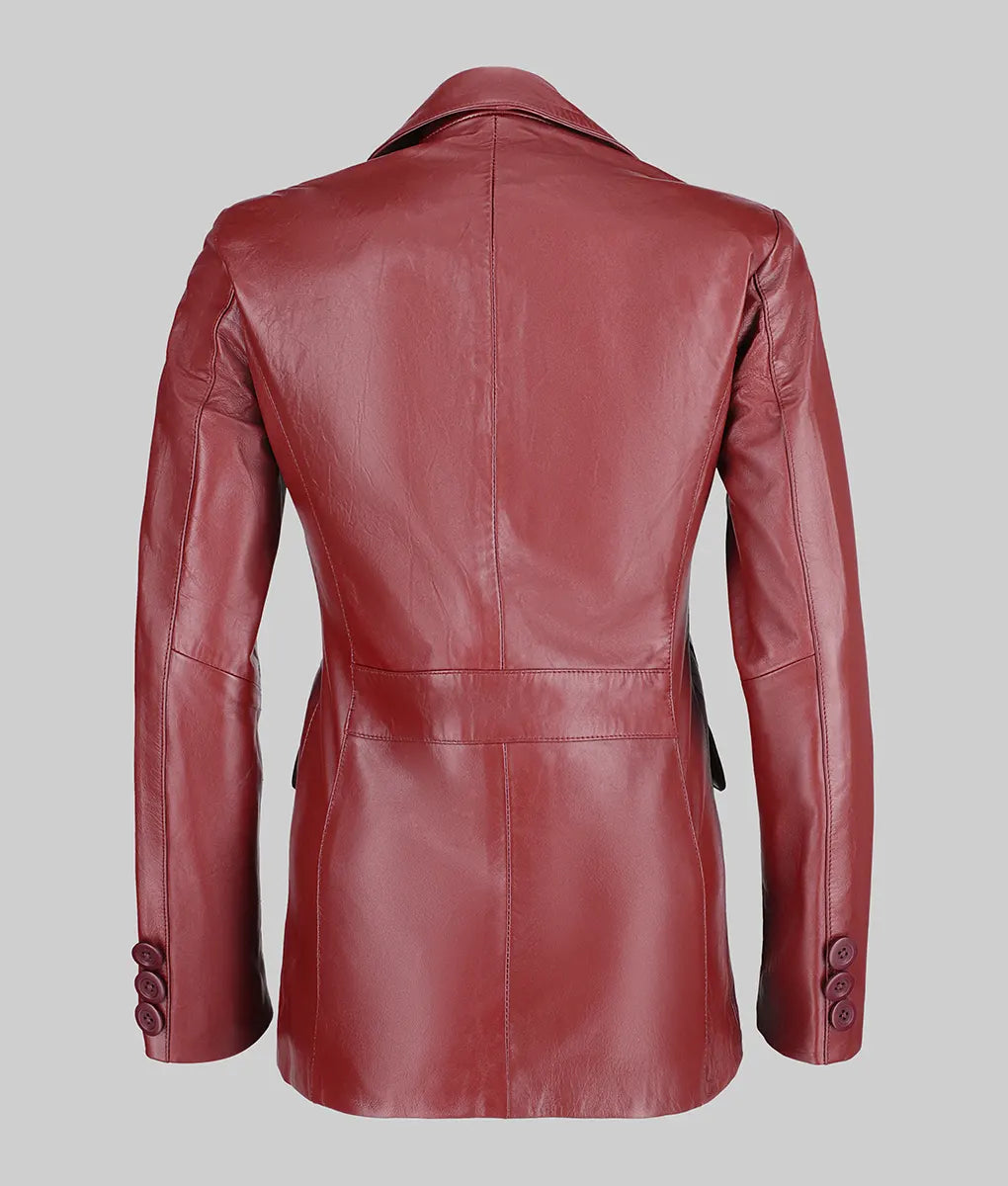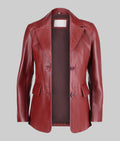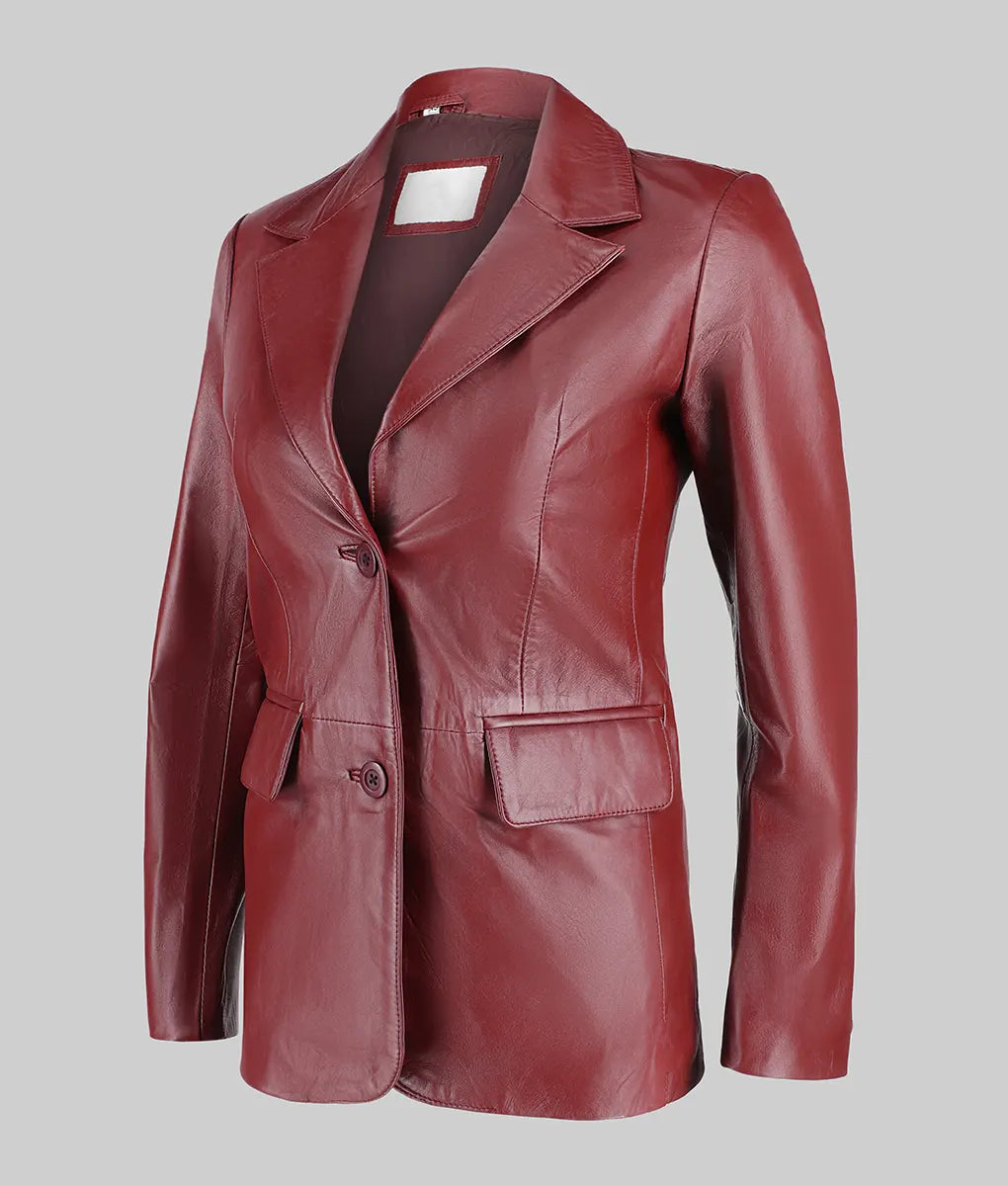 Women Genuine Leather Blazer Jacket, Female's Maroon Two Button Leather Blazer Coat, Lapel Collar Jacket